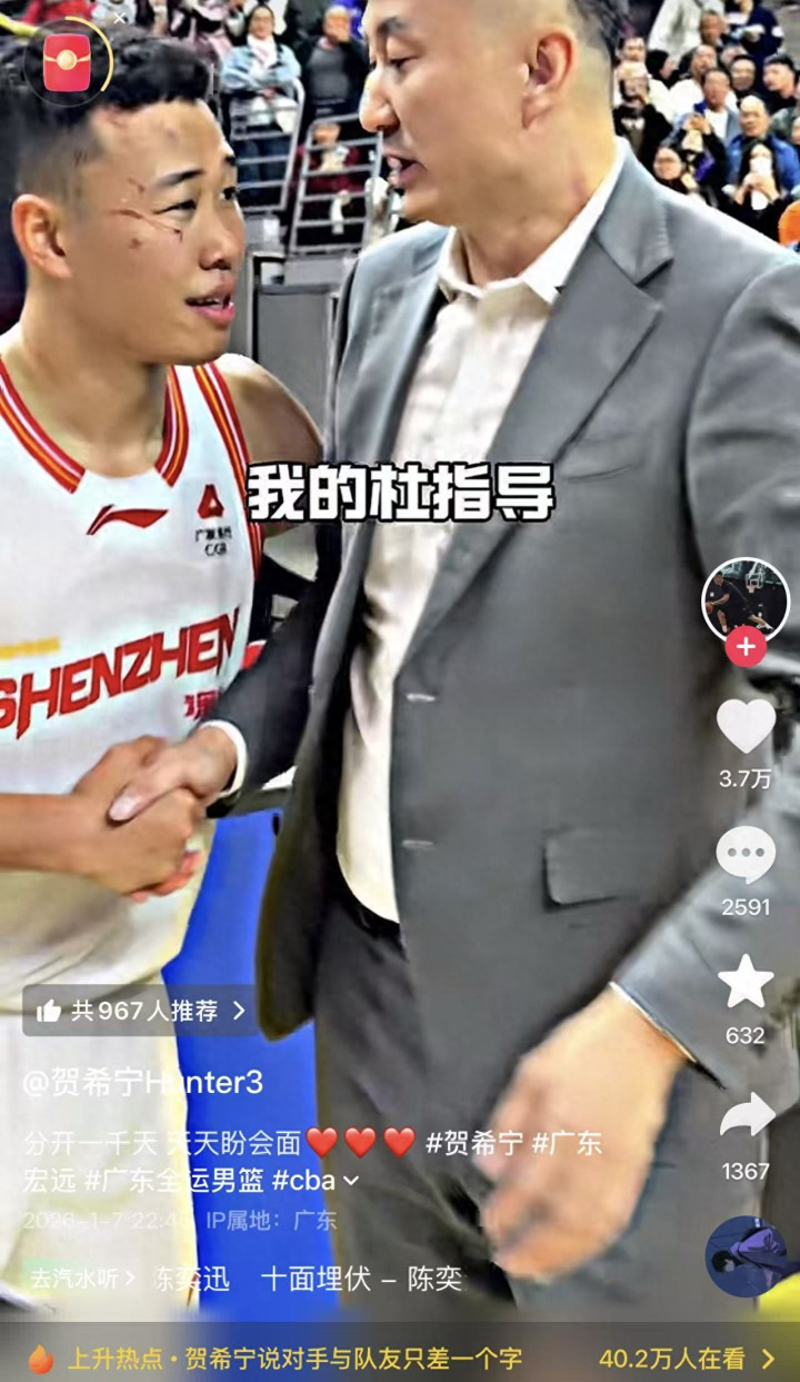 “分开一千天,天天盼会面”。深圳球员贺希宁在社媒晒出与广东球员、教练打招呼的视频,配文全部是我的,我的小胡、我的徐中锋、我的文昊跟文逸、我的老萨、我的杜导、我的卡比兽、我的驴、我的山东王家政、我的全运会中锋焦泊乔、我的私生饭黑粉头子小崔、全运会为我挡拆的少杰,贺希宁几乎提到了每一位广东球员,甚至把没有一起打过球的萨姆纳称为可爱的奶茶哥,从这些昵称可以看出贺希宁有多喜欢广东男篮!
