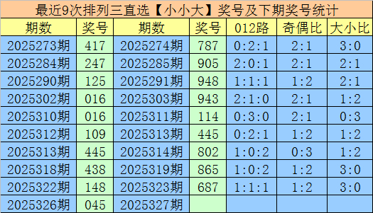 1.排列三第2025326期奖号开出045,大小直选分布为:小小大,在历史开奖中直选【小小大】分布已开出882期,在前9次直选【小小大】分布中,出现奖号为:417-247-125-016-016-109-445-438-148,组三开出1期,组六开出8期。