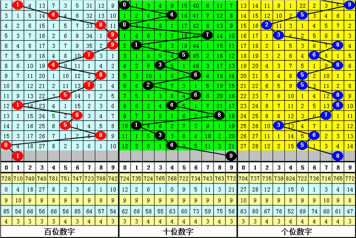 3.在以上9期奖号中,号码012路比分别开出0:2:1、2:0:1、1:1:1、2:1:0、0:3:0、0:2:1、1:0:2、1:0:2、1:1:1,012路出现个数比为8:10:9,本期预计开出012路比1:1:1。