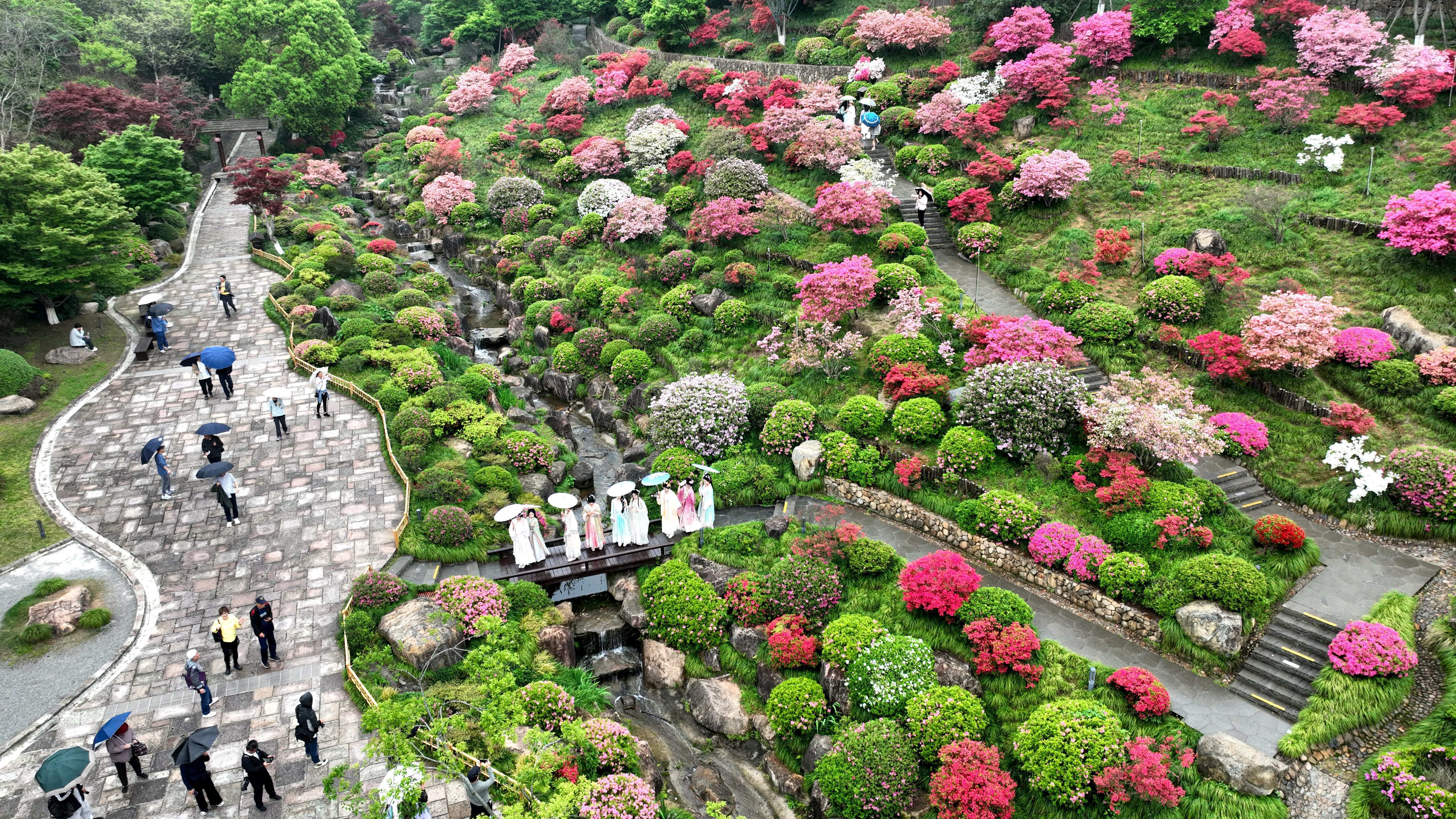 4月11日,游客在浙江省湖州市德清县下渚湖奇幻谷欣赏杜鹃花(无人机照片)。